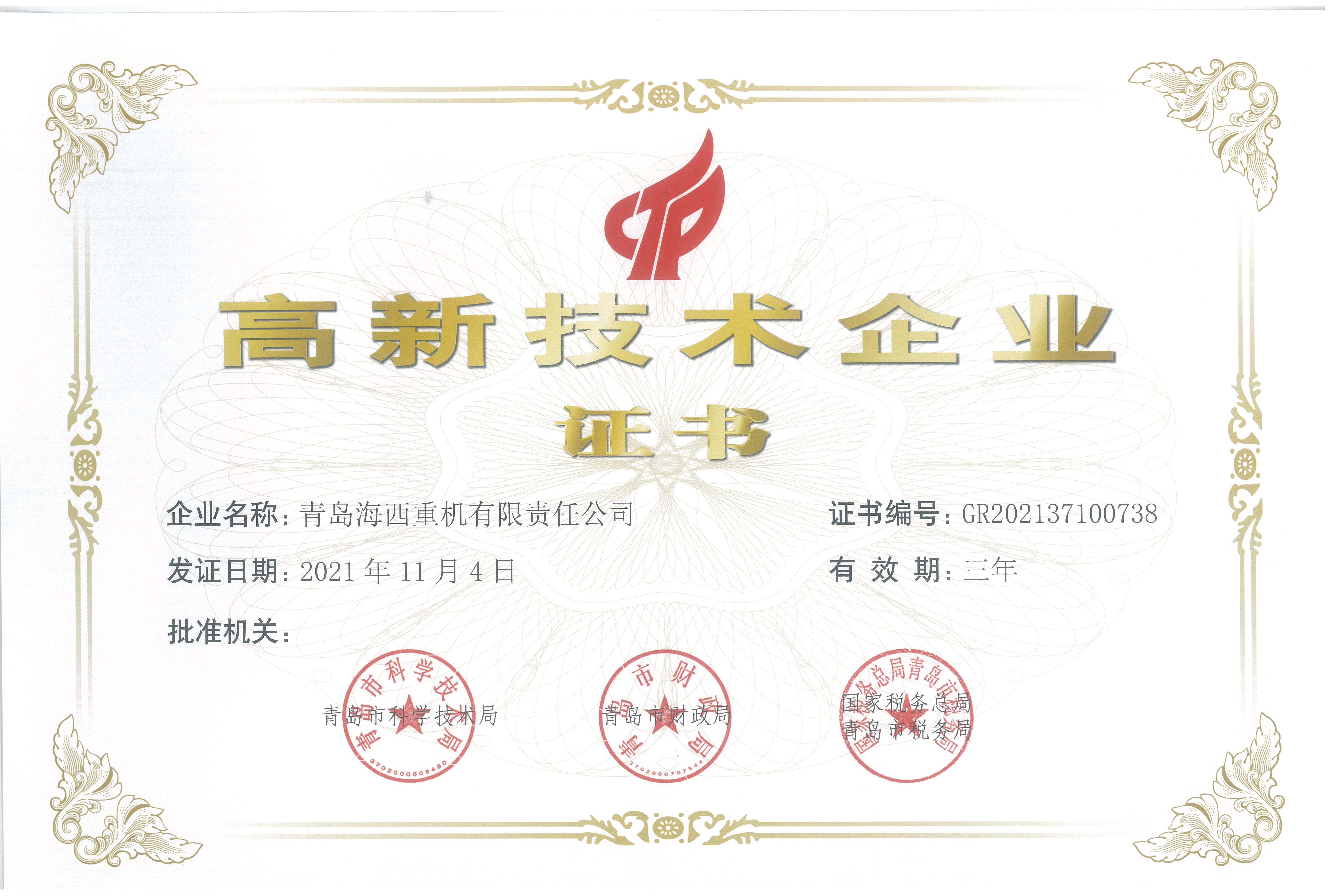近日,中國船舶集團旗下武漢船機海西重機公司收到由青島市科學技術局、青島市財政局、國家稅務總局青島市稅務局三部門聯(lián)合頒發(fā)的《高新技術企業(yè)證書》,這是海西重機自2012年首次認定高新技術企業(yè)以來,第四次通過高新技術企業(yè)認定。