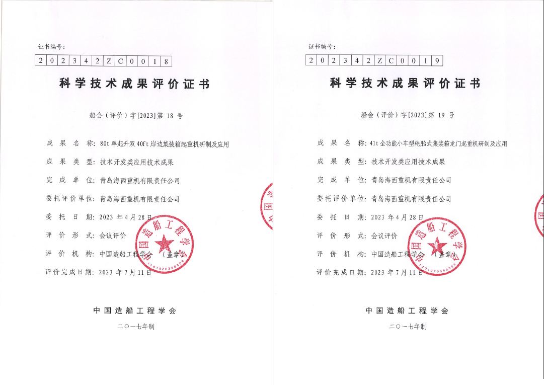 近日,中國(guó)船舶集團(tuán)旗下武漢船機(jī)海西重機(jī)公司“80t單起升雙40ft岸邊集裝箱起重機(jī)研制及應(yīng)用”、“41t全功能小車型輪胎式集裝箱龍門起重機(jī)研制及應(yīng)用”兩項(xiàng)科技成果通過(guò)中國(guó)造船工程學(xué)會(huì)科學(xué)技術(shù)成果評(píng)價(jià),與會(huì)專家一致認(rèn)為,整體技術(shù)水平達(dá)到國(guó)際先進(jìn)水平。