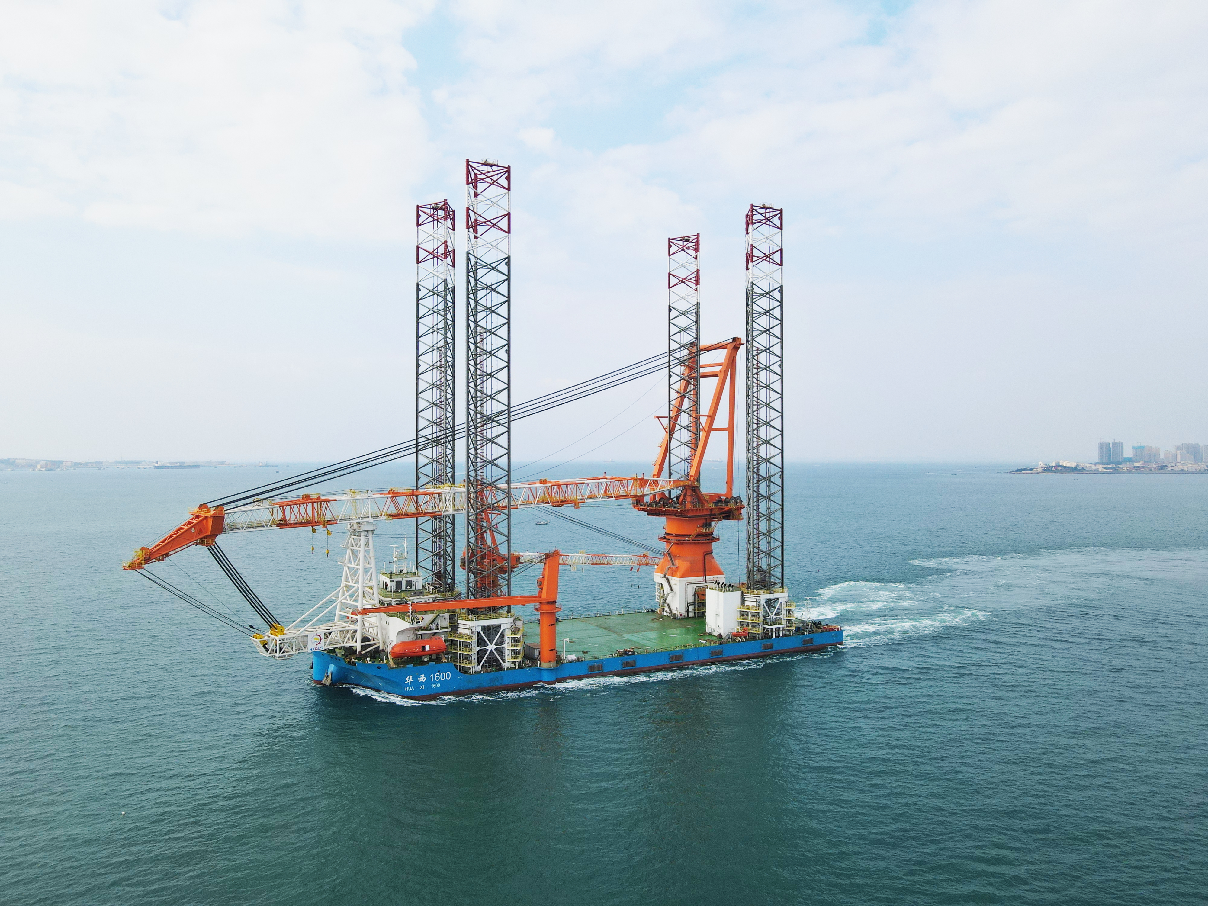 華西海工1600T風(fēng)電安裝平臺項目是武漢船機建造的最新一代風(fēng)電安裝平臺,最大作業(yè)水深70米,主吊機起重能力1600噸,甲板作業(yè)面積相當(dāng)于11個籃球場,是目前國內(nèi)作業(yè)水深最大、海上施工能力最強、功能最全、效率最高的桁架式樁腿風(fēng)電安裝平臺。