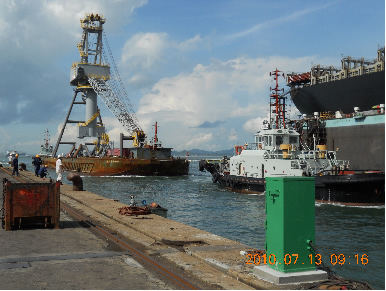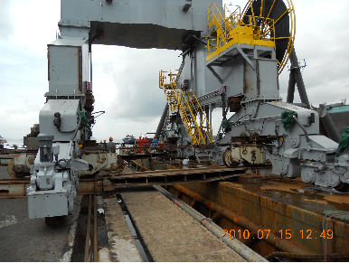 2010年7月15日,我公司為香港聯(lián)合船塢集團(tuán)有限公司(HUD)承制的MQ5050門座起重機(jī)到達(dá)香港HUD公司碼頭并安全滾裝上岸。該門機(jī)采用臺車輔助、整機(jī)滾裝、整體捆扎、拖輪加平板駁船的運(yùn)輸方式,從青島至香港航次歷時(shí)8天。