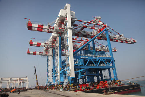 這次滾裝的三臺(tái)設(shè)備中,1500T/H卸船機(jī)是為華能(福建)海港公司研制的大型卸船機(jī)(共三臺(tái));兩臺(tái)MQ2535門(mén)機(jī)是為中國(guó)重要深水港口之一,西南部第一大港——廣西防城港生產(chǎn)的首批(共七臺(tái))門(mén)座起重機(jī)。這次三臺(tái)大型港機(jī)在同一天內(nèi)整機(jī)順利滾裝成功,再次驗(yàn)證了公司設(shè)計(jì)水平、制造工藝、組織能力和海綁捆扎工藝的成熟性,也標(biāo)志著武漢船機(jī)投資的青島海西重機(jī)經(jīng)過(guò)了近7年的從規(guī)劃、建設(shè)到邊建設(shè)、邊生產(chǎn)步入到成熟的批量化生產(chǎn)港口設(shè)備階段。為青島海西重機(jī)的最終目標(biāo):成為“中國(guó)最具競(jìng)爭(zhēng)力的港口裝備、設(shè)備企業(yè)”邁出了堅(jiān)實(shí)的一大步。
