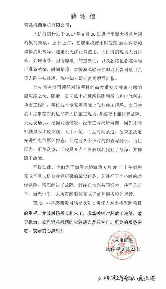 自今年年初設(shè)備交付以來(lái),海西重機(jī)定期安排技術(shù)人員進(jìn)行回訪(fǎng),協(xié)助業(yè)主方對(duì)設(shè)備進(jìn)行檢查和保養(yǎng),及時(shí)處理故障,保證設(shè)備高效運(yùn)作,有力地保障了現(xiàn)場(chǎng)施工的可靠性和穩(wěn)定性,海西重機(jī)工作人員負(fù)責(zé)、用心的工作態(tài)度和完善的售后服務(wù)得到了業(yè)主方的一致好評(píng),業(yè)主特發(fā)來(lái)感謝信給予表?yè)P(yáng)。