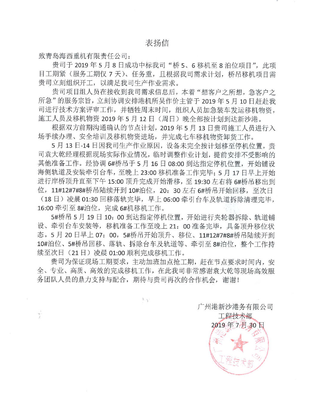 廣州港新沙港務有限公司發(fā)來了感謝信