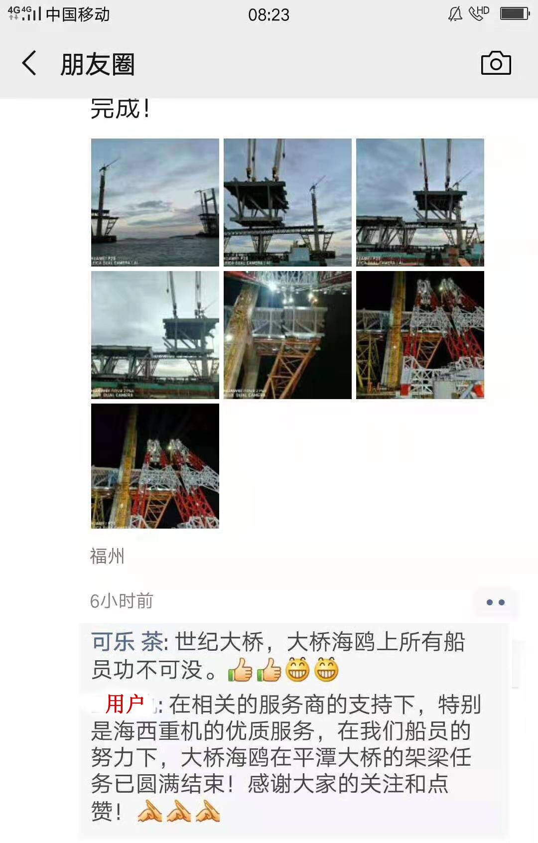 7月28日接到用戶通知,“大橋海鷗號”將于7月28日晚進行第64、65片8鋼梁的架設(單重達3200噸),為保證工程順利實施,請海西重機安排技術人員進行保駕護航,用船長的話就是“你們在現(xiàn)場,感到心里踏實”。公司當即安排附近正在羅源灣碼頭做電控系統(tǒng)改造的宋靖浩工程師,前往現(xiàn)場。7月2900日傍晚5點,吊裝正式開始,各崗位人員各負其責,密切配合。直到凌晨時分,2片鋼梁順利架設完成,設備運行一切正常,用戶對海西重機設備的穩(wěn)定性和服務的及時性給予了高度評價。至8月6日,平潭海峽公鐵大橋,最后一片鋼梁順利架設完成, “大橋海鷗號”不辱使命,圓滿完成任務。用戶喜悅的表揚,就是對我們優(yōu)質(zhì)服務的認可和正反饋。