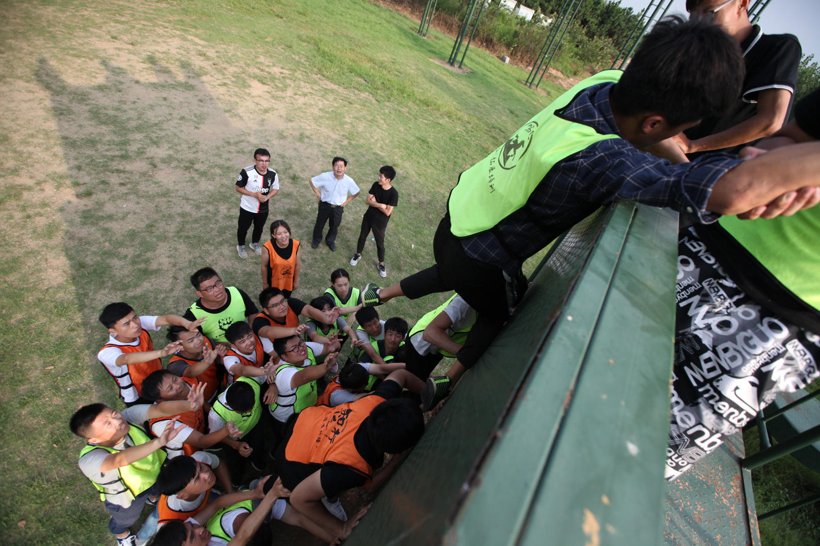畢業(yè)墻項目是最難的挑戰(zhàn),隊員們需要在不借助外部構造的條件下全部爬到4.2米的高墻上,時間只有七分鐘。通過搭建“人梯”,隊員們一個個送了上去。隊員們沒有經(jīng)過專業(yè)訓練,面對4.2米的高墻,墻下也沒有助力,最后一名隊員想要上去簡直太難了。墻上的隊員利用倒掛金鉤拉住墻下的隊員,大家都爆發(fā)了前所未有的力量,最后成功了,全體成員登上高墻,完成任務。宣布成功的這一刻,大家空前的團結,空前的感動,不拋棄,不放棄,才是一個真正的團隊。