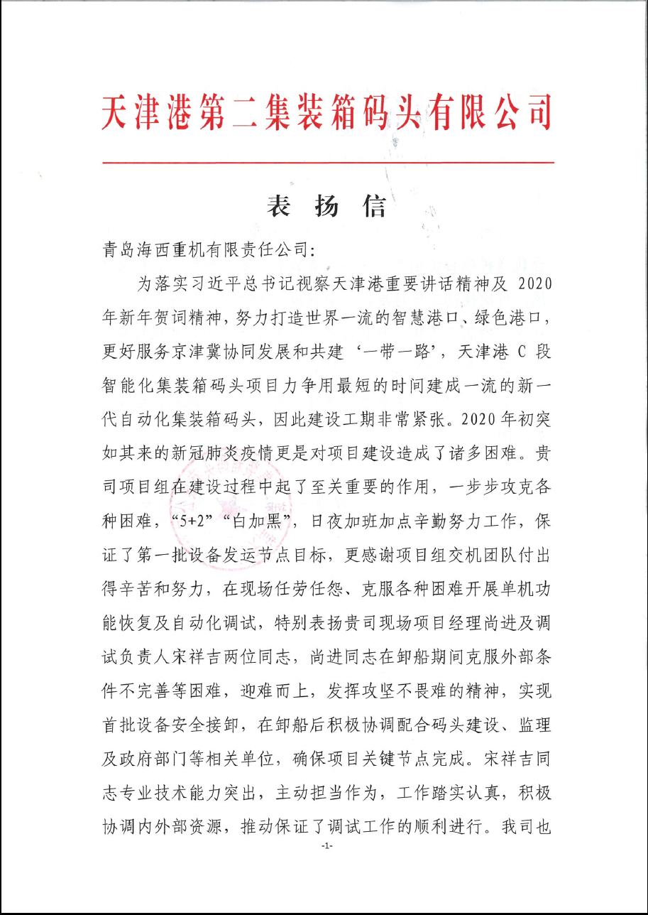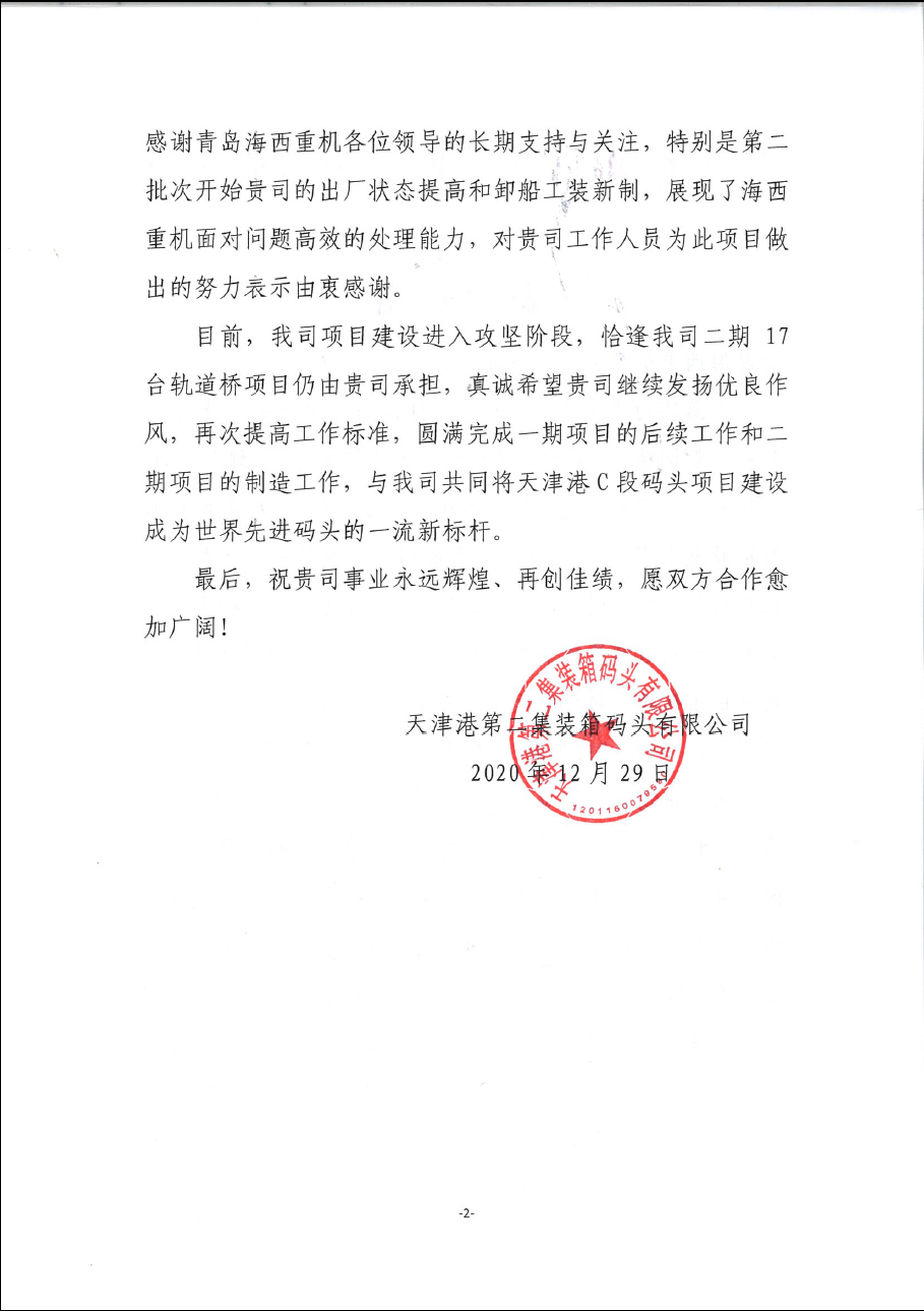 表揚(yáng)信的最后,天津港業(yè)主也對(duì)海西重機(jī)領(lǐng)導(dǎo)班子對(duì)于此項(xiàng)目的關(guān)注與支持表達(dá)了特別感謝,對(duì)于海西重機(jī)承制的二期17臺(tái)軌道吊項(xiàng)目表達(dá)了高度信任和美好期許!
