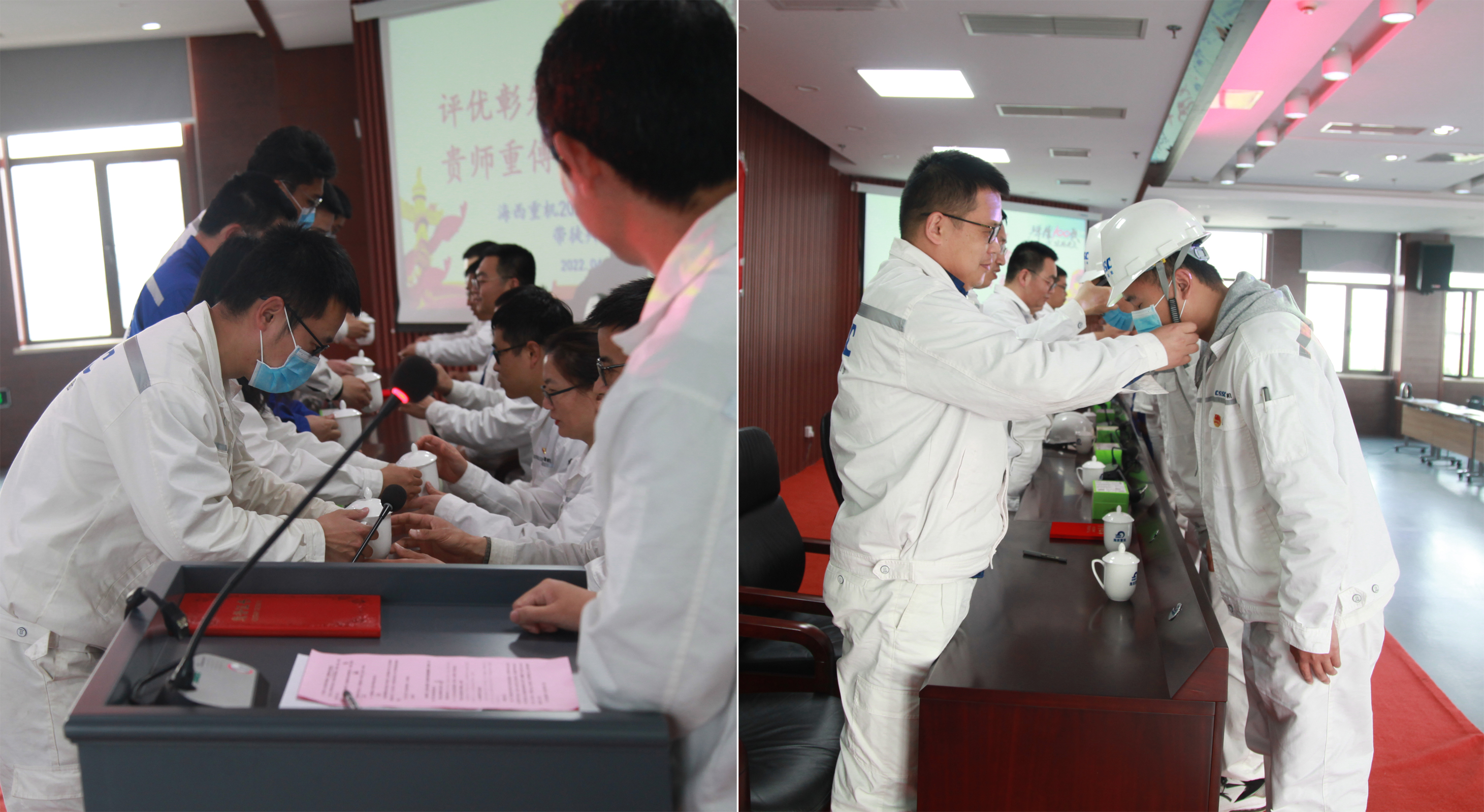 大會為2021年導(dǎo)師帶徒活動中的兩對優(yōu)秀師徒頒獎,表彰他們在師徒結(jié)對過程中的優(yōu)異表現(xiàn)。其后,2022年新結(jié)對的七對師徒舉行了傳統(tǒng)的“敬茶拜師禮”和“傳寶正冠禮”,并分別簽訂了《導(dǎo)師帶徒目標(biāo)責(zé)任書》。徒弟們紛紛鞠躬向師傅敬“尊師茶”,一杯香茗滿載著徒弟們對師傅濃濃的敬意和虛心學(xué)習(xí)的決心。師傅們?yōu)橥降堋皞鲗氄凇保瑐鬟f的是師傅的關(guān)愛和殷切期望。隆重儀式加深了師徒間的歸屬感與認同感,拜師禮畢,師徒對子的紐帶更加堅固了。