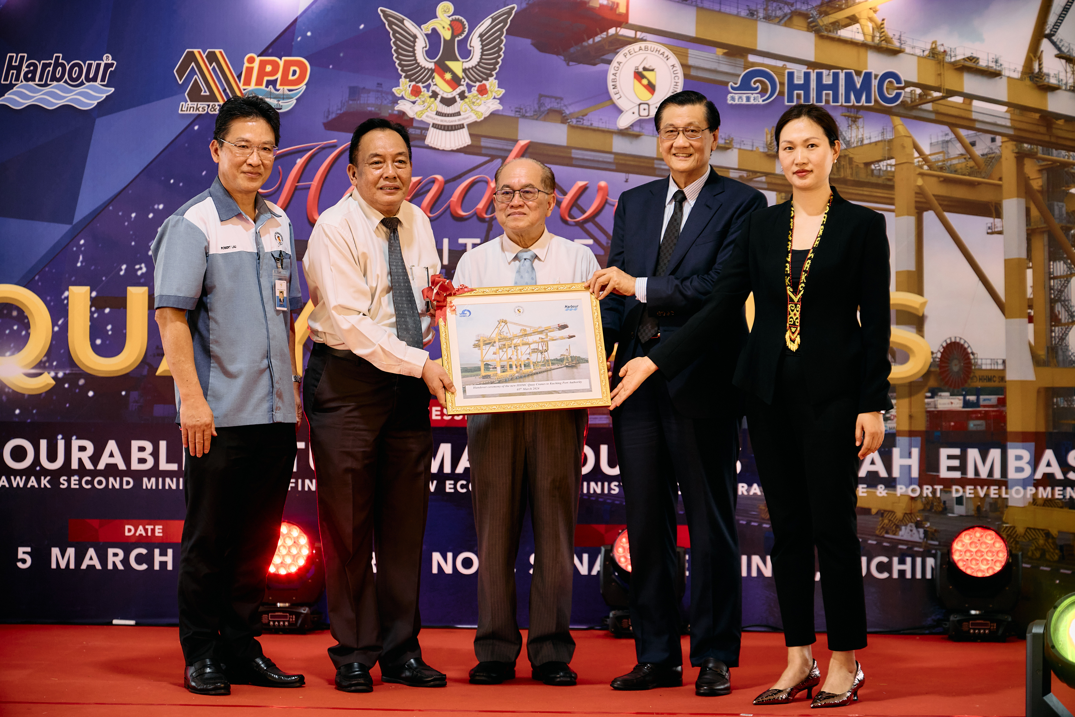 交機儀式上,馬來西亞砂拉越州副總理兼基礎(chǔ)建設(shè)與港口發(fā)展部部長Amar Douglas Uggah Embas、古晉港港務(wù)局主席Awang Bemee Bin Hj.Pengiran Ali Basah、Harbor Link集團董事長Francis Yong Piaw Soon蒞臨現(xiàn)場并分別致辭,各方強調(diào)了該項目對當?shù)馗劭诎l(fā)展的重要經(jīng)濟意義與社會意義,同時對海西重機產(chǎn)品以及項目團隊給予了充分肯定。隨后,各方在岸橋前進行剪彩并合影留念。