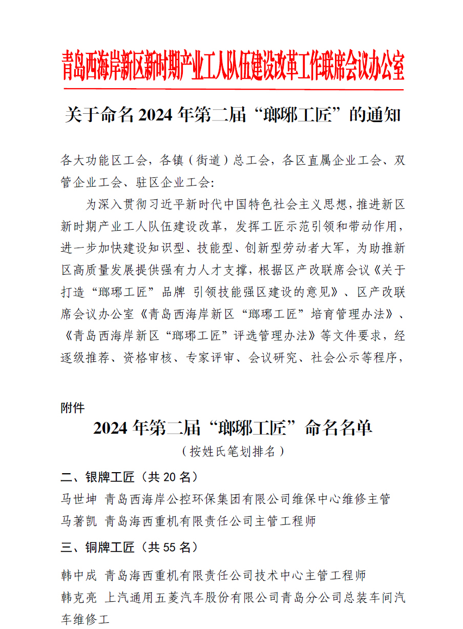 為深入貫徹習近平新時代中國特色社會主義思想,推進新區(qū)新時期產業(yè)工人隊伍建設改革,發(fā)揮工匠示范引領和帶動作用,進一步加快建設知識型、技能型、創(chuàng)新型勞動者大軍,為助推新區(qū)高質量發(fā)展提供強有力人才支撐,根據區(qū)產改聯席會議《關于打造“瑯琊工匠”品牌引領技能強區(qū)建設的意見》、區(qū)產改聯席會議辦公室《青島西海岸新區(qū)“瑯琊工匠”培育管理辦法》、《青島西海岸新區(qū)“瑯琊工匠”評選管理辦法》等文件要求,經逐級推薦、資格審核、專家評審、會議研究、社會公示等程序,最終100 名同志脫穎而出,入選新區(qū)第二屆“瑯琊工匠”。