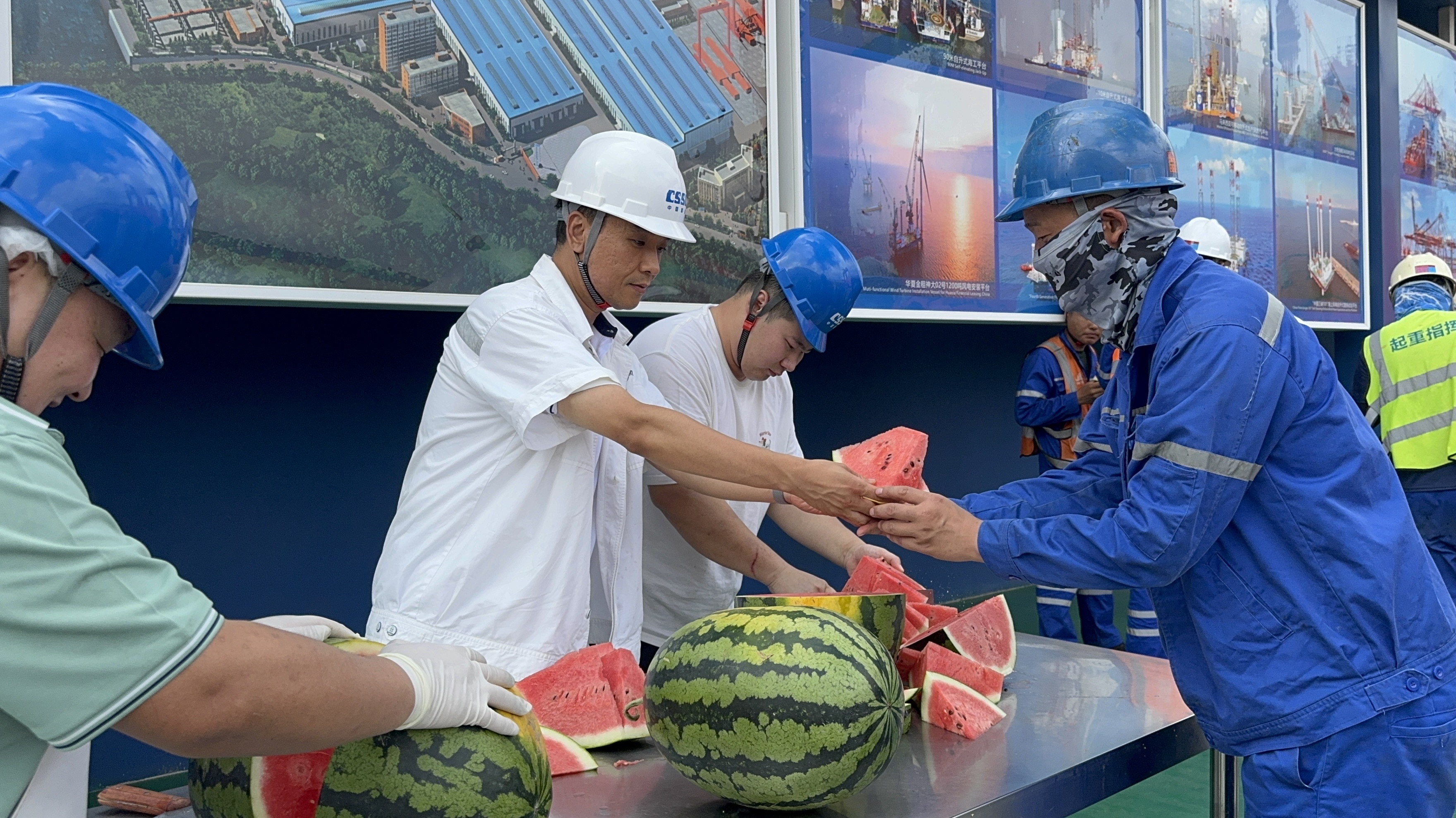6月份,海西重機工會提前啟動防暑降溫專項工作,制定詳細(xì)的“送清涼”活動實施方案。自7月初至8月下旬,在廠區(qū)設(shè)立5個固定“清涼驛站”——新車間二跨通道、噴砂房、3號變電站、300噸門機作業(yè)區(qū)、港機部60噸通道,每日供應(yīng)常溫綠豆湯,適時供應(yīng)西瓜。并針對戶外作業(yè)人員,發(fā)放藿香正氣口服液,確保防暑全覆蓋。