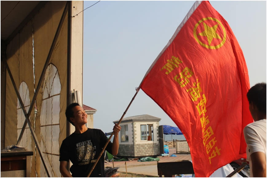 圖為團(tuán)委成員在活動(dòng)現(xiàn)場(chǎng)樹立“青島海西重機(jī)團(tuán)委”旗幟