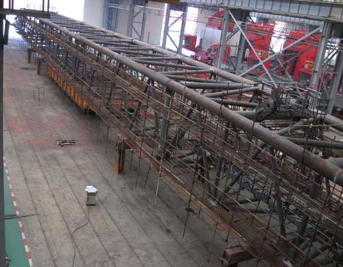 500T全回轉(zhuǎn)固定吊臂架長(zhǎng)110米,寬6.5米,高5米,重達(dá)200余噸。自接到生產(chǎn)任務(wù)以來(lái),針對(duì)該項(xiàng)目生產(chǎn)任務(wù)緊、制作周期短、難度大等特性,鋼構(gòu)部統(tǒng)籌部署,多管齊下,確保項(xiàng)目進(jìn)展。首先以節(jié)點(diǎn)實(shí)現(xiàn)率為重點(diǎn),細(xì)化施工隊(duì)、焊工隊(duì)節(jié)點(diǎn)考核,嚴(yán)格執(zhí)行;其次考慮技術(shù)熟練程度和連續(xù)性,所有施工及管理人員均采用3600T浮吊臂架原班人馬,各工種24小時(shí)不間斷作業(yè),全力推進(jìn)項(xiàng)目進(jìn)展;第三各負(fù)責(zé)調(diào)度、檢驗(yàn)人員、工藝人員等各司其職、齊心協(xié)力,監(jiān)管措施到位,工序銜接順暢,確保臂架各分支計(jì)劃穩(wěn)步推進(jìn)。在各項(xiàng)有效措施的保障下,在工藝部和品質(zhì)部的全力配合下,該臂架制作歷時(shí)不到40天,制作周期較同類(lèi)型吊臂架縮短了一倍以上,且一次探傷合格率達(dá)98.5%,結(jié)構(gòu)質(zhì)量和外觀成型得到了業(yè)主的一致認(rèn)可和表?yè)P(yáng),創(chuàng)造了鋼構(gòu)部制作行架結(jié)構(gòu)件的奇跡!